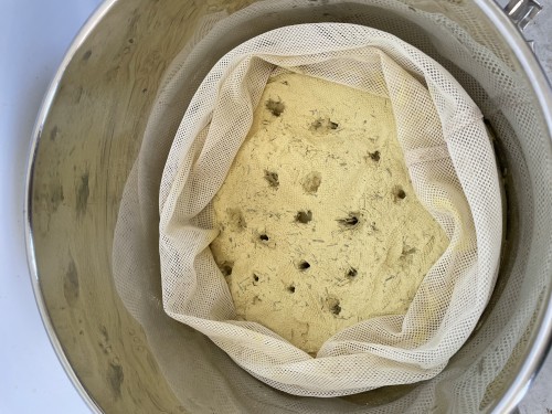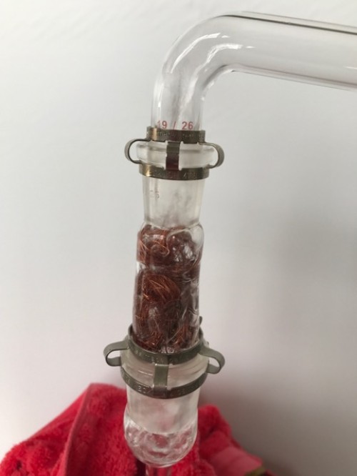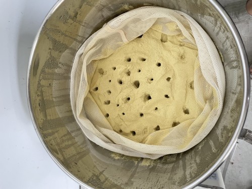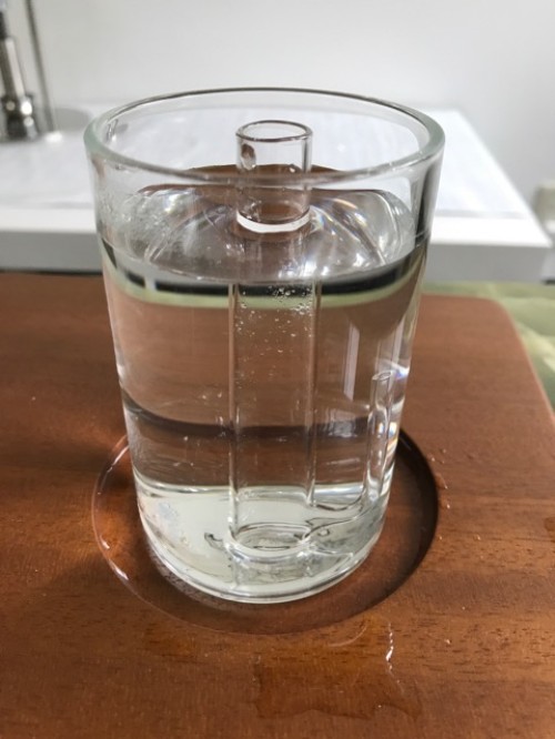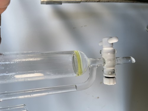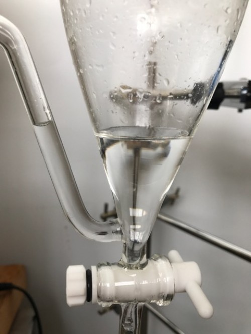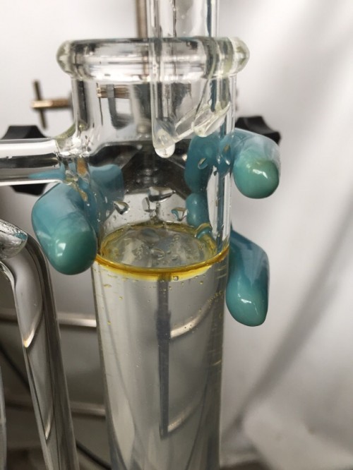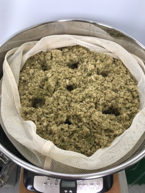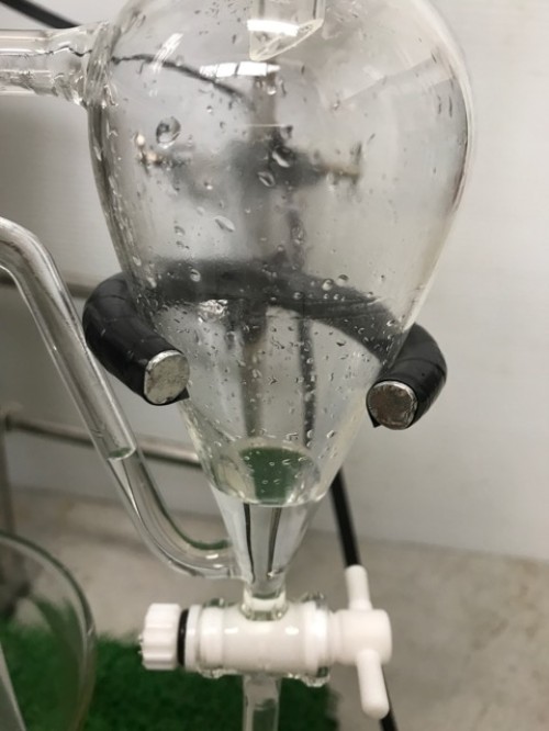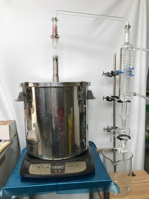 ホップ粉末(26年度分)の蒸留。生の時と同じ25Lとロングオイルセパレーター使用。粉末の場合、菜箸やお玉の柄などで蒸気が通りやすいよう蒸気穴をあけておく。に黄色いオイルが確認できるが採取困難。ウォーターは良い香り。