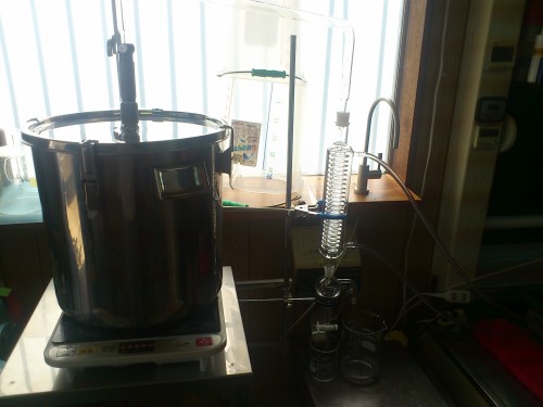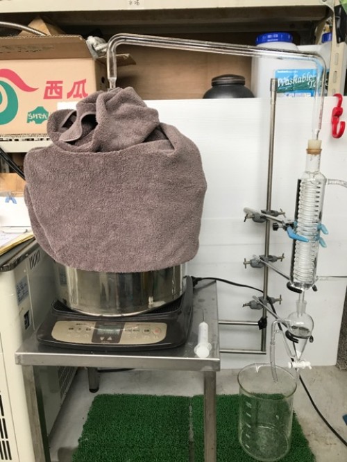 フレッシュのホップのスチーム蒸留。ロングオイルセパレーター使用。毬穂を手で半分に割ってから蒸留釜へ。オイル・ウォーター黄色い。精油は確認できたがオイルセパレーターにくっついてとりわけが困難。香りはかすかに柑橘を感じるさわやかな香り。(以前蒸留したホップの香り(ビールのほろ苦さが感じられた)とは違う。)