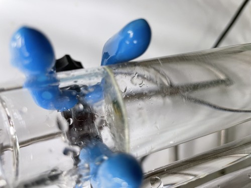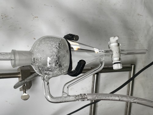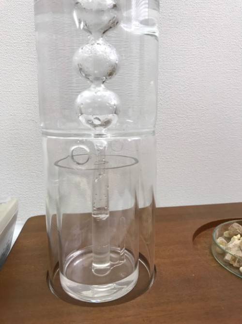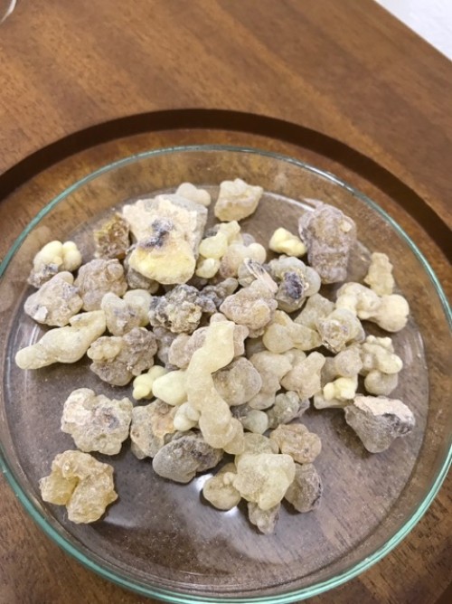 カンラン科の植物 フランキンセンスの木からとれる樹脂(粒状)の蒸留です。フラスコ内を撹拌すためスターラーを使用しピュアスティーラーミニで煮出し蒸留しました。加水は800ml.。透明なオイルが採れました。