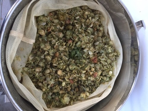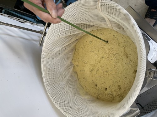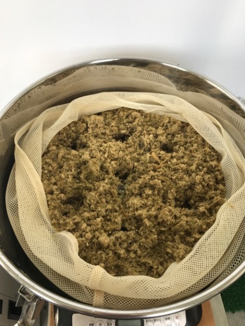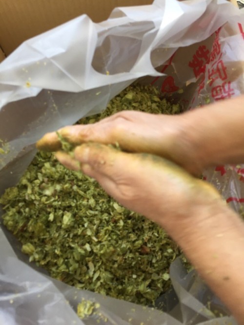 乾燥ホップ。手ですりつぶしてから蒸留釜へ。作業時間1名1時間。蒸気がっとりやすいようにお玉の柄で穴をあける。黄色いオイル。さわやかな香り。