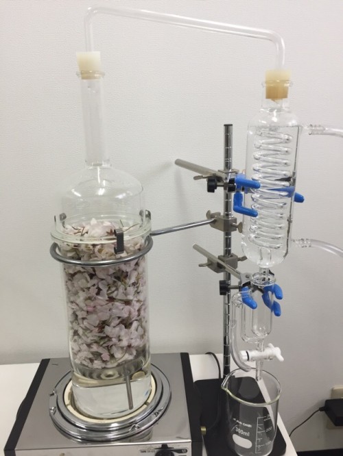 採ってきてすぐのサクラの花をLiteでスチーム蒸留。サクラはオイルは採れないが、水に溶けやすい成分ベンズアルデヒド(杏仁の香り)がウォーターでとれる。出始めから3分で取り分けたウォーターは杏仁のとても良い香り。3~30分まではまだ杏仁の香りがする。その後は煮えた香り。