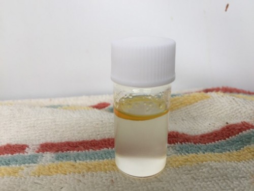キンモクセイのabs(アブソリュート)です。キンモクセイの香りは蒸留では採る事が出来ません。ヘキサンなどの溶剤に漬けてから採取する事が出来ます。ヘキサンに漬けこみ、香り成分をヘキサンにうつし、固形物を除去してヘキサン溶液を作る。エバポレーターでヘキサン除去しエタノールを加えて-20℃に冷却、ワックス質を析出させた後、ワックス質をろ過・除去した後再度、エバポレーターでエタノール除去しabsアブソリュートの完成。