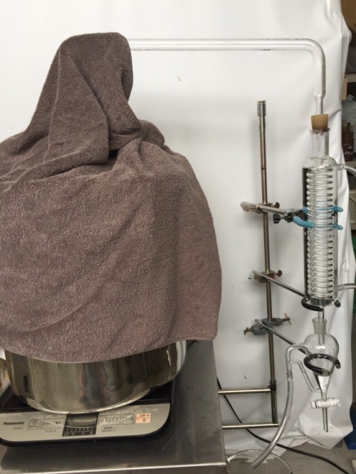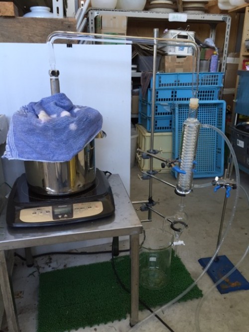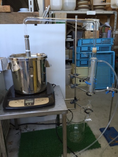 会社のローズマリー 剪定で切った枝葉をIH仕様で水蒸気蒸留。加水は 600ml。