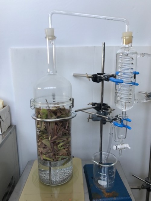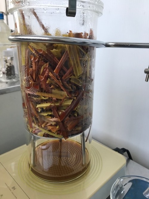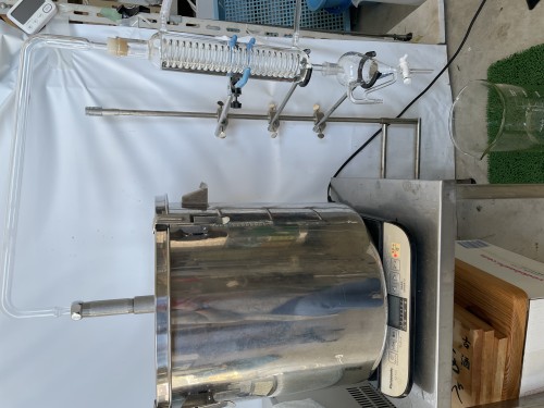 前日にレモングラス到着。前処理で5、6cmにカットして蒸留釜へ。今回3.5kg入れたが 最大4kgほどは入りそう。オイル13ml抽出率0.37%。事前に36L購入で蒸留されていた時よりも黄河で蒸留した時の方がオイルがとれている。(自分たちでは8ml程度)カット方法とネットに入れた材料と鍋の隙間が原因か?香りは同じ。レモングラスの良い香り。