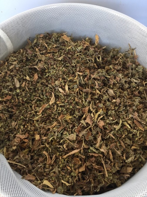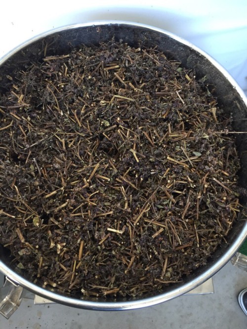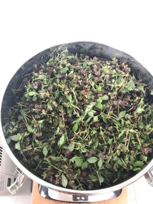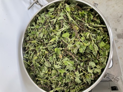 前日に到着したホーリーバジル(フレッシュ)。2日前に送付されたようでビニール袋に入れてあった為フレッシュなので蒸れて少し傷みもあった。到着後、広げて保管した。手にとると葉が落ちて茎だけになってしまう。葉と穂先をカットして蒸留釜へ3,660gで満タン。