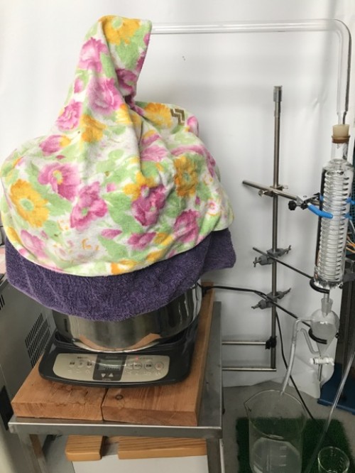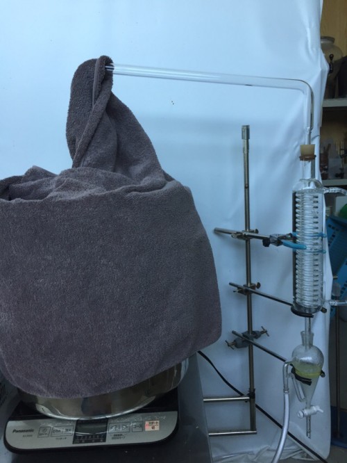 ホーリーバジル(トゥルシー)の蒸留です。ホーリーバジル(トゥルシー)は最近人気のハーブで、インドのアーユルヴェーダでは「不老不死の霊薬」とされ、また、ガパオ等のタイ料理にも使われていることで知っている方も多いと思います。スパイシーな刺激の中にミントの様な清涼感のある香りと「リナロール」の心をリラックスさせる効果があるとされるハーブです。今回はドライ。抽出率2.31%なかなかの抽出率です。蒸留時間120分。