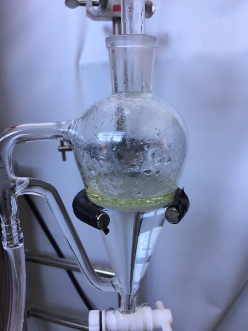 ドライのホーリーバジルの蒸留。材料自身の香りは強かった。茎部分が多い。抽出率はそう高くないが香りは良い。